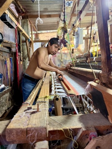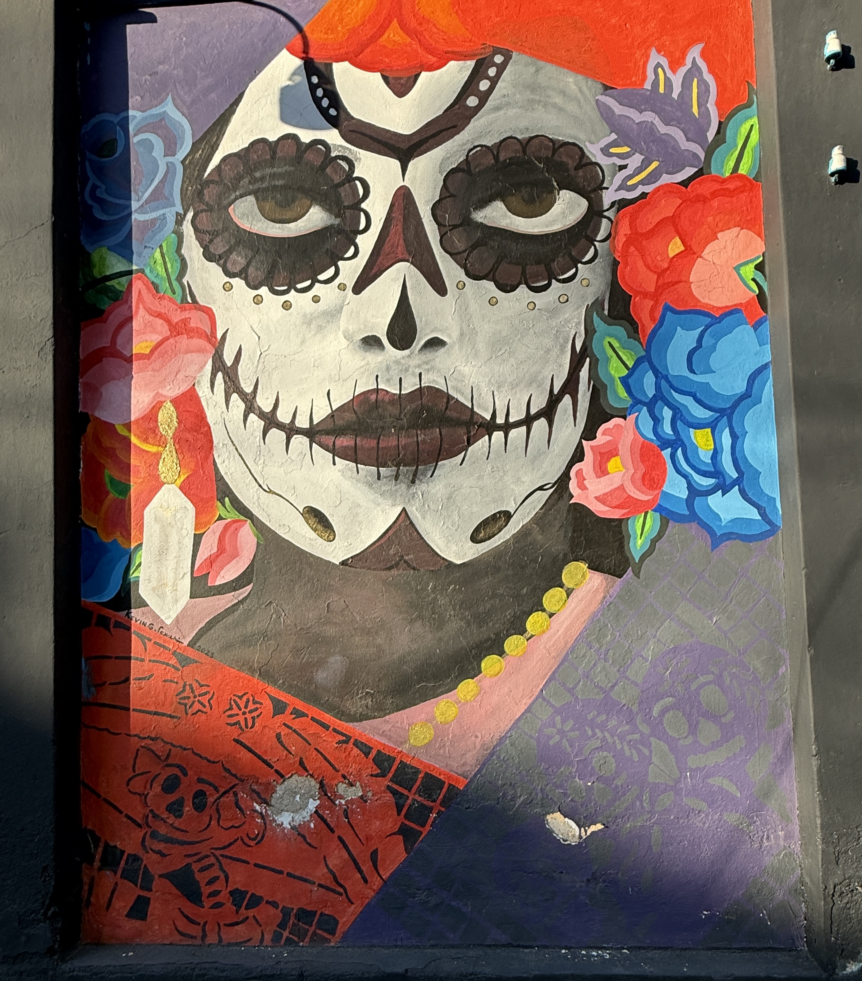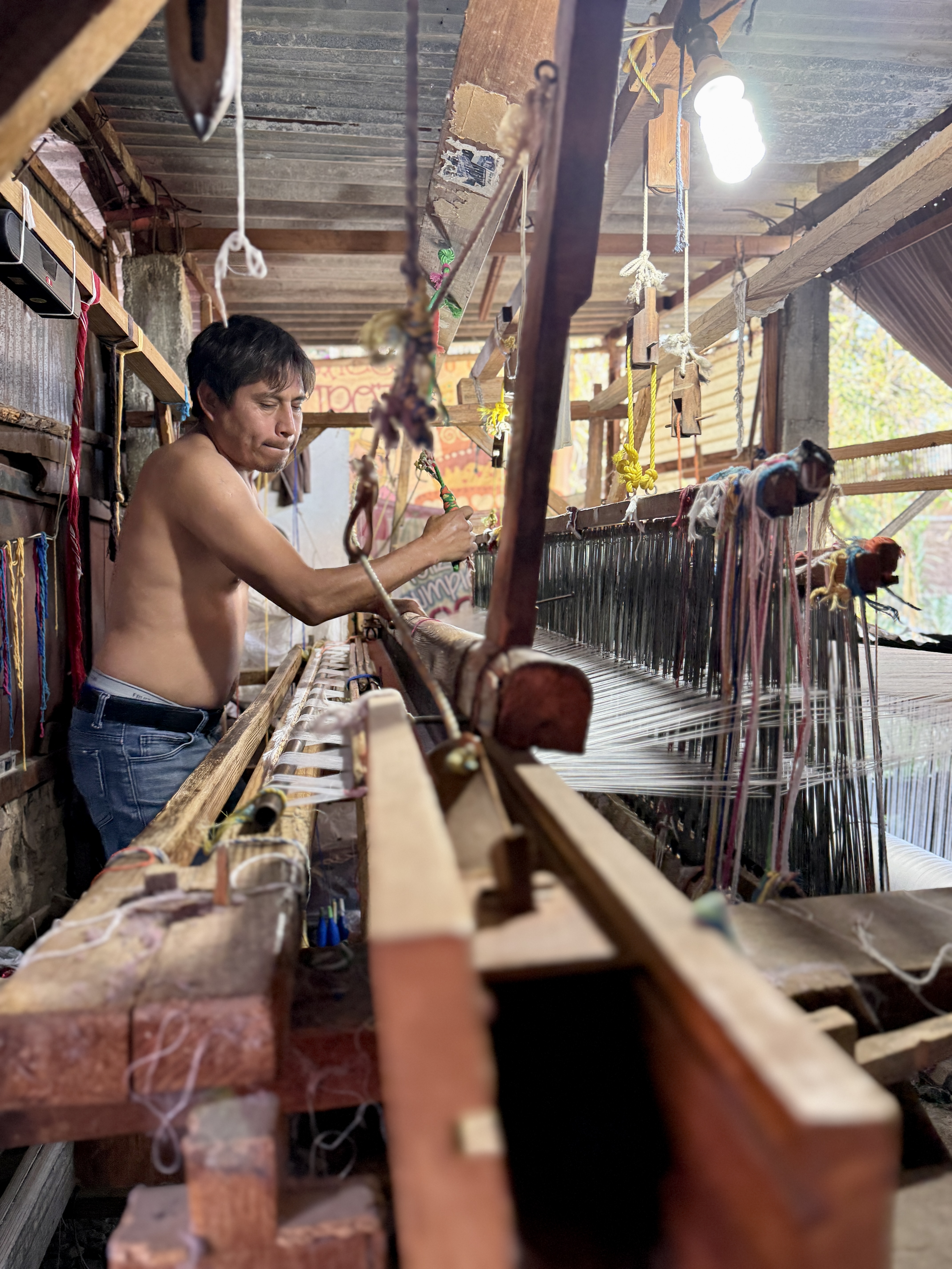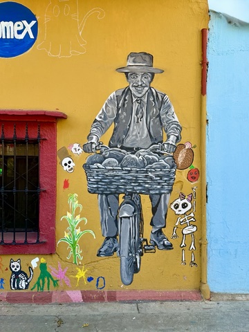 Ok.. so, based on the fact that yesterday sort of never happened–in that we were in bed in the hotel room and missed New Years celebrations and my birthday, I think I can officially say that I did not add a year and am the same age as in 2025. We were able to have a very very light breakfast (pancakes) at the hotel and then figured we were strong enough to venture out for a while. We went to a neighborhood further from the center (taxied there and then walked back)–Xochimilko. Again a wonderful neighborhood with lots of murals and little cafes (but we didn’t dare eat anything. We managed to walk back although at the moment I’m not sure how we did that. We also ventured upon a weaver in his rather cramped studio in Xochimilko.