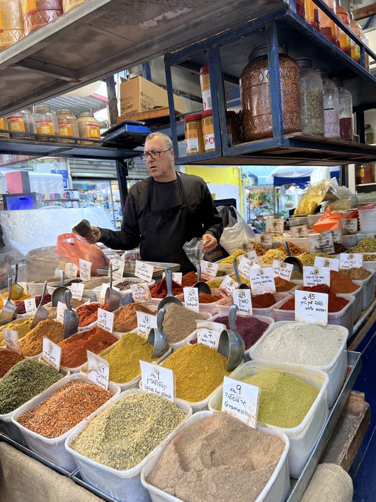 And within the market there are hundreds of little “restaurants” and cafes and food stalls where you can get lots of very appealing foods, breads, desserts, or snacks to eat as you walk. While we weren’t really that hungry, everything looked so good that we just gave up and settled into a little place that I think was called “The Greek.” It was just a counter that surrounded a bar and it was bustling. We were drawn to it because a lot of loud music was playing, and everyone was singing along with the music. We think they were singing Greek songs but in Hebrew (but not knowing either language it was a little difficult to discern). Everyone was drinking lots of Ouzo and eating while they sang. We waited for stools at the counter and once we had our seats (two of the 25+/- seats) we ordered dolmas and zucchini fritters and wine. Everything came with tzatziki and the food was great.