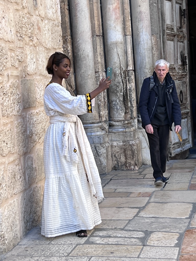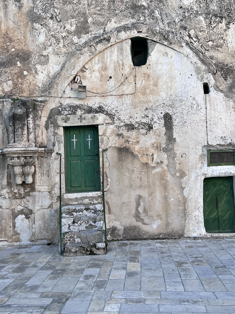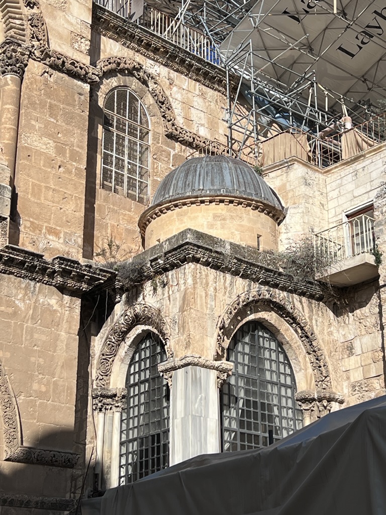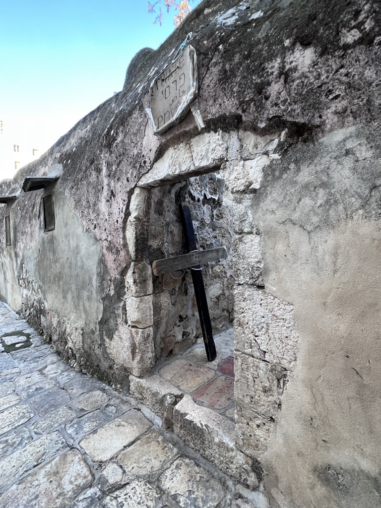 We then figured that instead of walking the whole way to the old city, we should hop in a taxi (using my trusted Gett app) and we headed for the Jaffa Gate. Once there we walked first to the Church of the Holy Sepulchre, in the Christian quarter, built in the 4th century – considered to be the most sacred site in the world for millions of Christians. It’s supposedly the site of the crucifixion, burial, and resurrection of Jesus. The church is a major Christian pilgrimage destination, especially on Sundays, like today. Control of the church is shared by multiple Christian denominations. We also climbed up to the roof of the church where we are told poor Ethiopian pilgrims and monks live in little huts, and where a dome of the chapel can be seen. Apparently, Ethiopians built this tiny village atop the church to continue their claims to the chapel after they had to sell it to the Coptic church in the 17th century. We saw the stone and cement “huts” but we didn’t see any of the monks. We saw many doors that led into private spaces, each with signs saying that the area was private.
