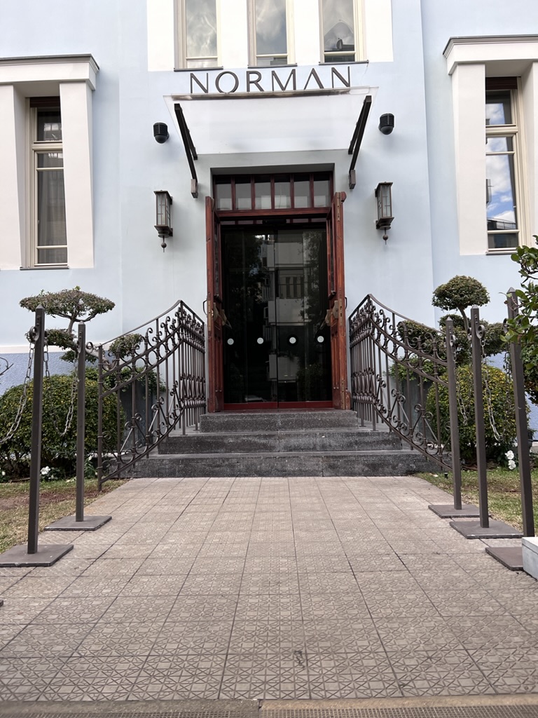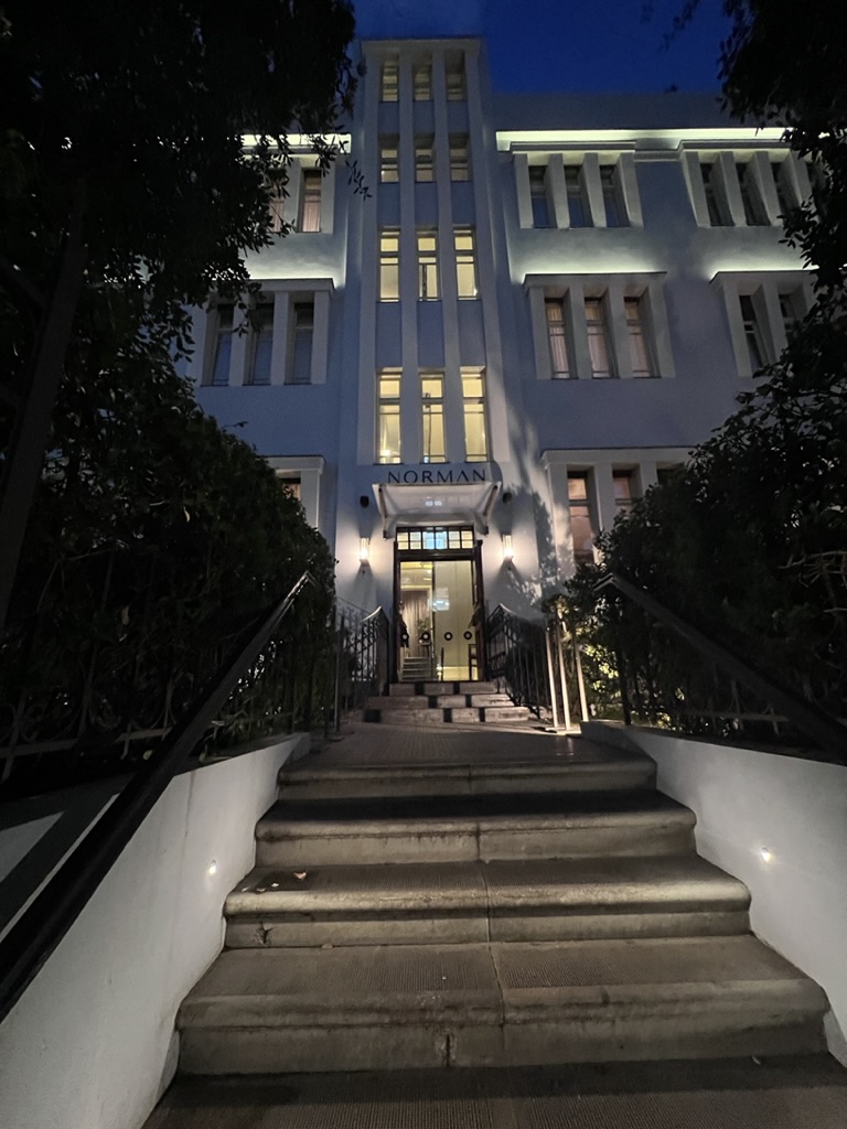 Then Mike called that he was walking as well, having soaked up enough sun—and we agreed to meet at The Norman, an iconic hotel. It apparently began with three residential buildings of different architectural styles, one of which was influenced by the Bauhaus. It has lots of character and history and is quite elegant. Since I hadn’t revealed my little ice cream lunch, I met Mike in the restaurant (Alena) and we ate a late lunch (4:00). We had a wonderful pizza that had eggplant as its base (instead of tomato sauce) and Israeli cheese and spices and then just as it comes out of the oven, they put an egg yolk on top which gets warmed by the pizza. Really rich and very tasty.. Then we followed that with a calamari dish that was also very good.. and paired so well with our wine.