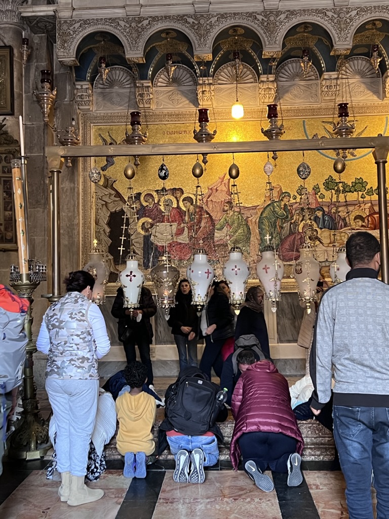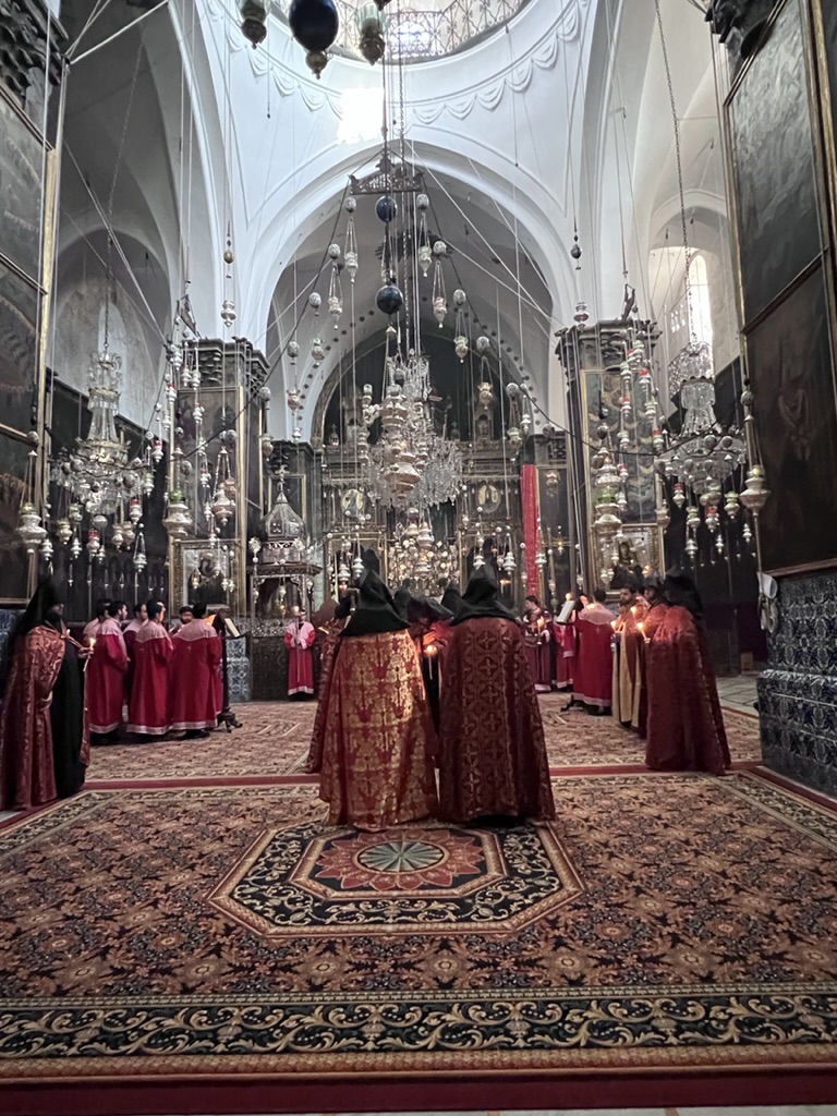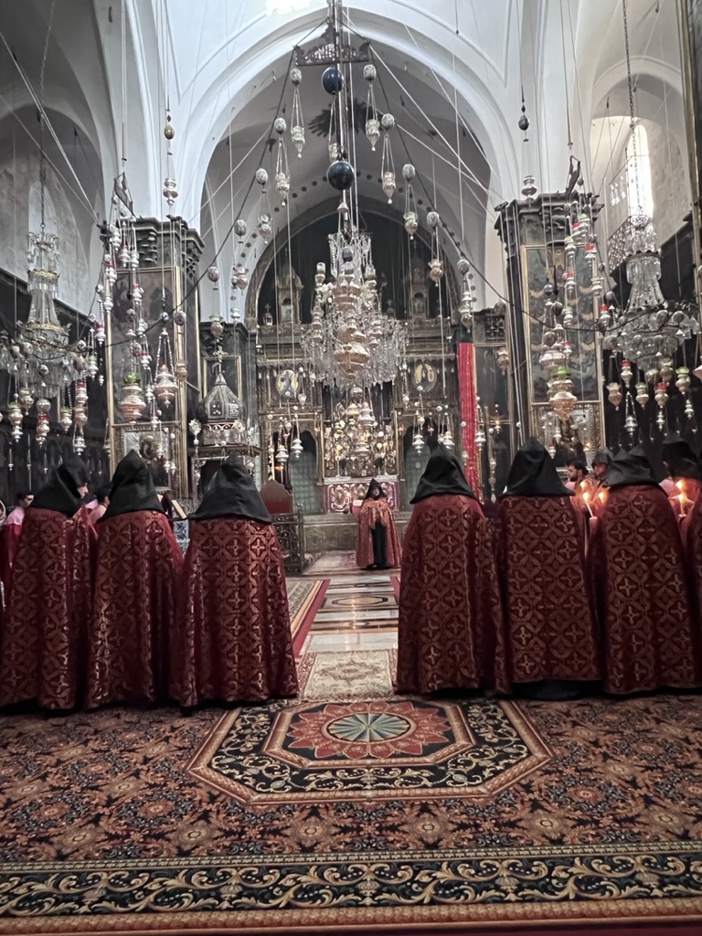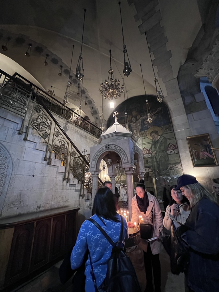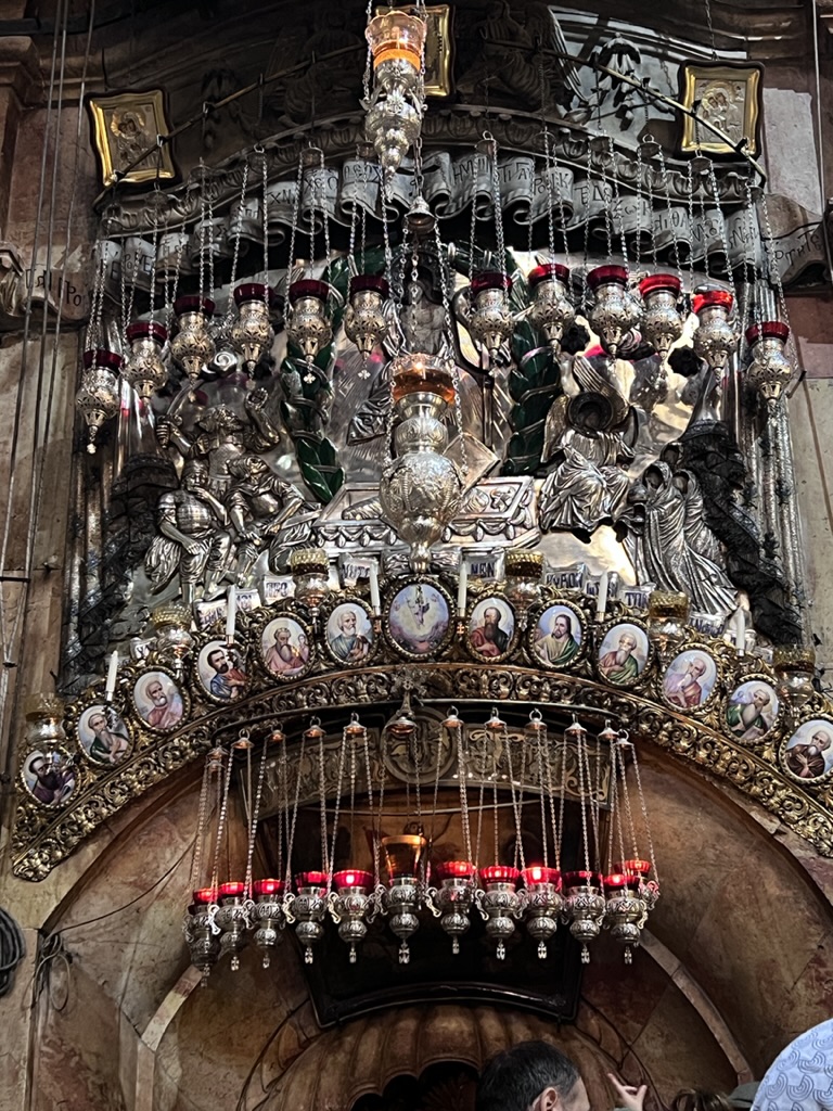 From the Church of the Holy Sepulchre we dashed off to the Church of St. James. It’s nestled within a walled compound in the ancient Armenian Quarter of the Old City. It’s ornately decorated with lots of hanging glass chandeliers and what I think are incense vessels. It dates to AD 420. The church is only open to the public during religious services. The interior, under a vaulted dome, includes a display of massive chandeliers, countless lamps, paintings, carved wood, inlaid mother-of-pearl, bronze engravings, and blue and green wall tiles. The marble floor was covered with purple, green and red carpets when we were there. The service includes (all men) young novitiates (?) and elders (who could use a little dieting) wearing black hoods. Incense and candles are burning everywhere and there’s amazing singing echoing throughout the building (all of which seemed to be in a common tone – no sopranos, no altos). There is a part of the service where the younger dudes place very ornate capes on the older guys. The service has a lot of chanting. There’s no electricity so everything is by the light of candles. Very effective and moving.