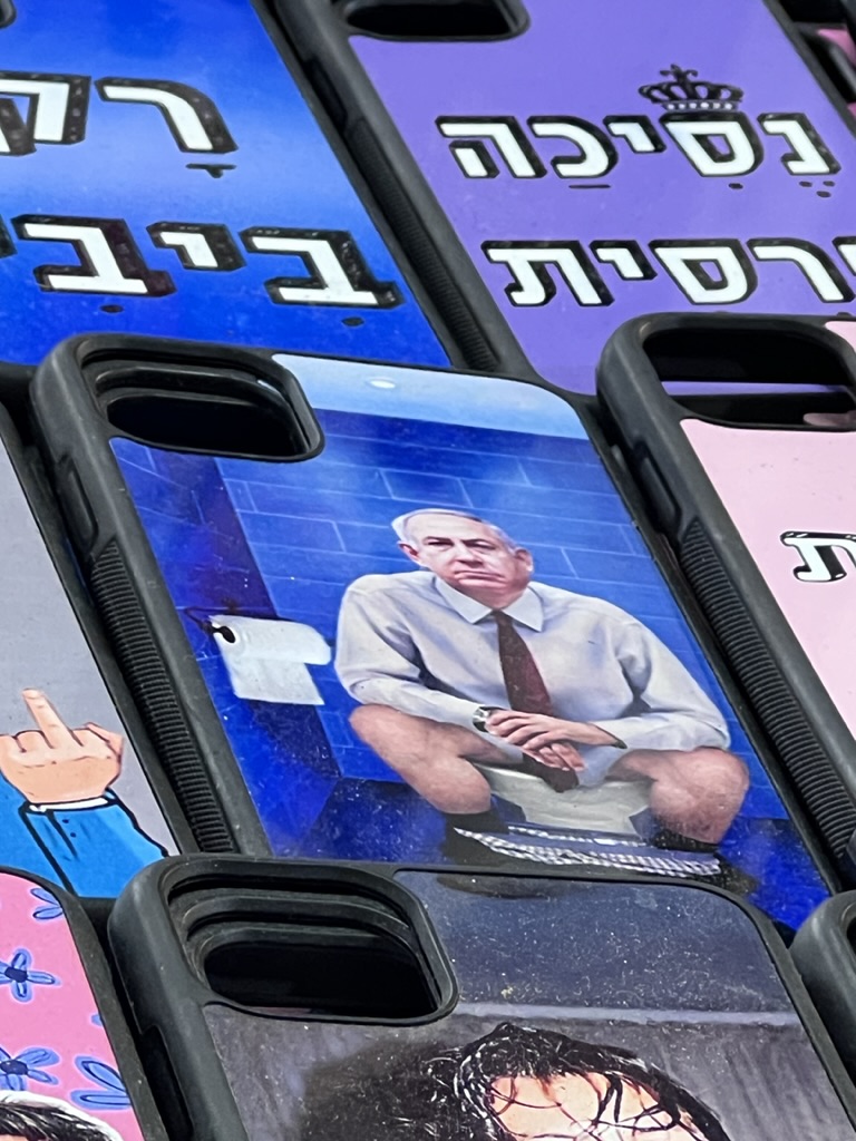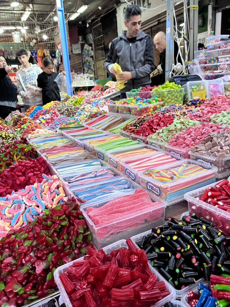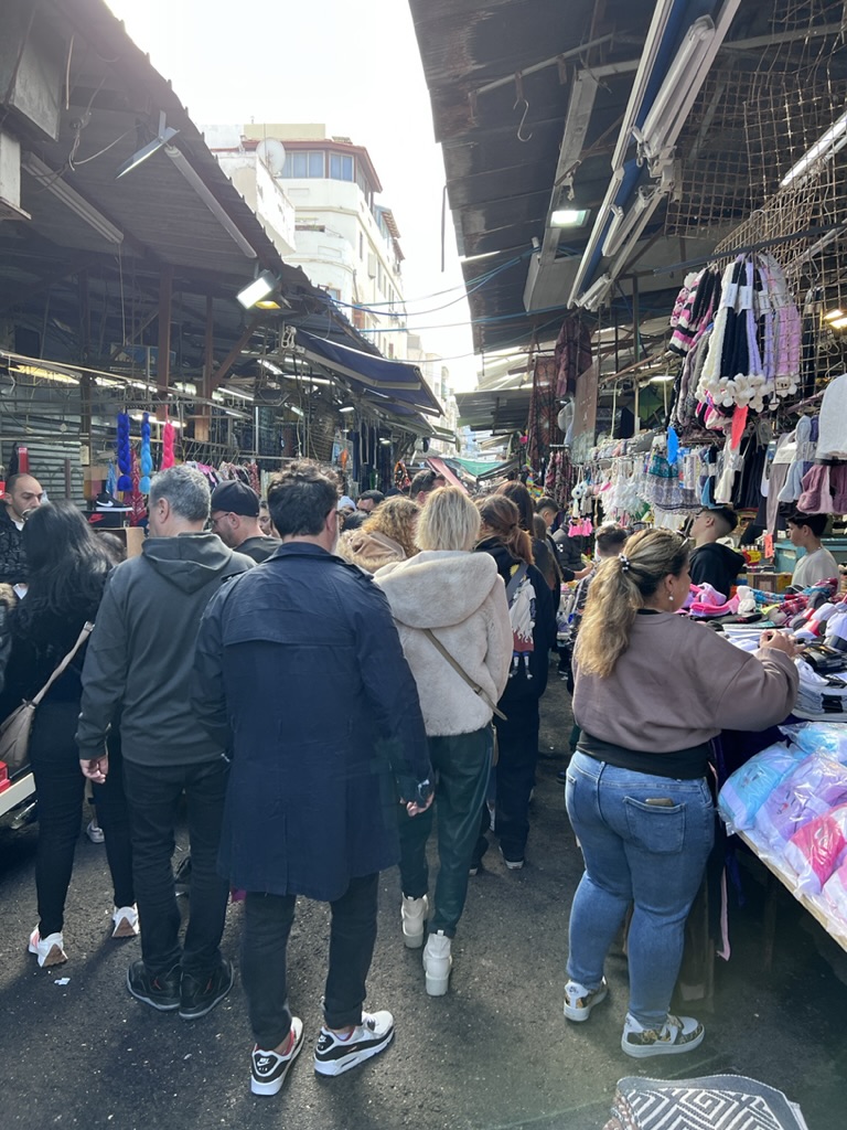We strolled under the overcast grey sky to the very vibrant and very crowded Carmel Market (Shuk Hacarmel) — the largest market (shuk) in Tel Aviv. Here you can get everything from spices to clothing to electronics to fruits and vegetables to candy to cases for your cellphone (including one that shows Netanyahu sitting on a toilet). The Market is more than 100 years old, nearly as old as the city of Tel Aviv itself. The layout of the market is simple with one street that runs throughout the entire length of the market and several “auxiliary” short side streets.