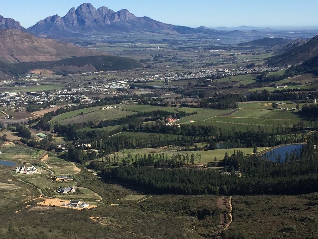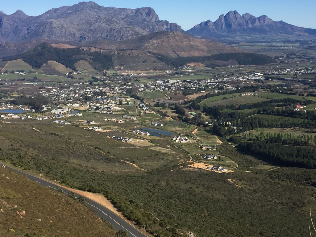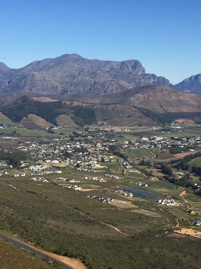 Today, bright and early Chris and I left for Franschhoek – a small town (population about 15,000) located about an hour north of Cape Town. According to our host, the area was settled in the 1600s by French Huguenot refugees… many of whom got land from the Dutch… They named it Olifantshoek (Elephants’ Corner) because elephants crossed the area… Then the name was changed to “The French Corner” and later to Franschhoek (Dutch for “French Quarter”). There’s evidence of the French influence in the names of many of the vineyards. Initially this was a big farming area and now the farms have been transformed into vineyards.