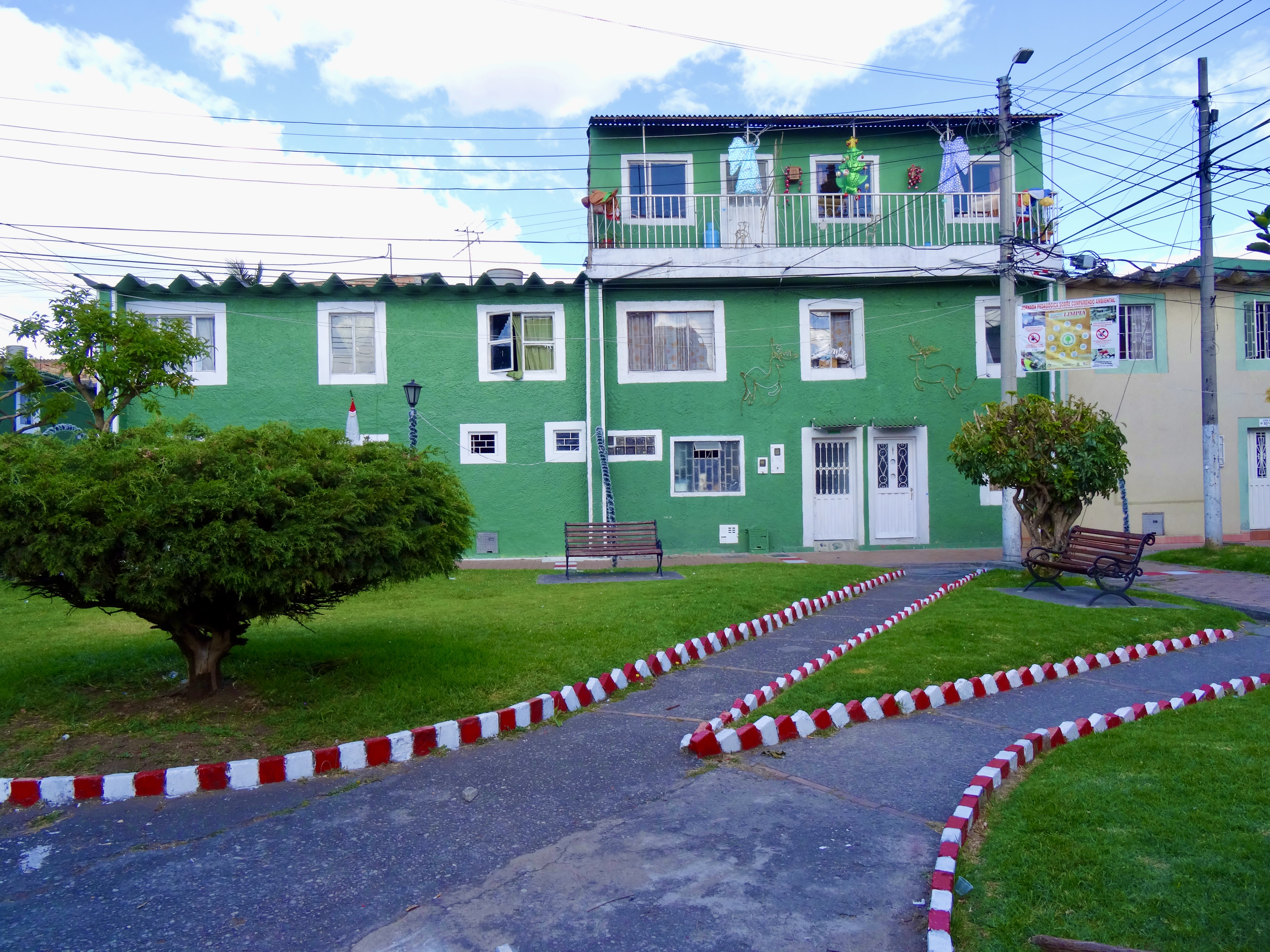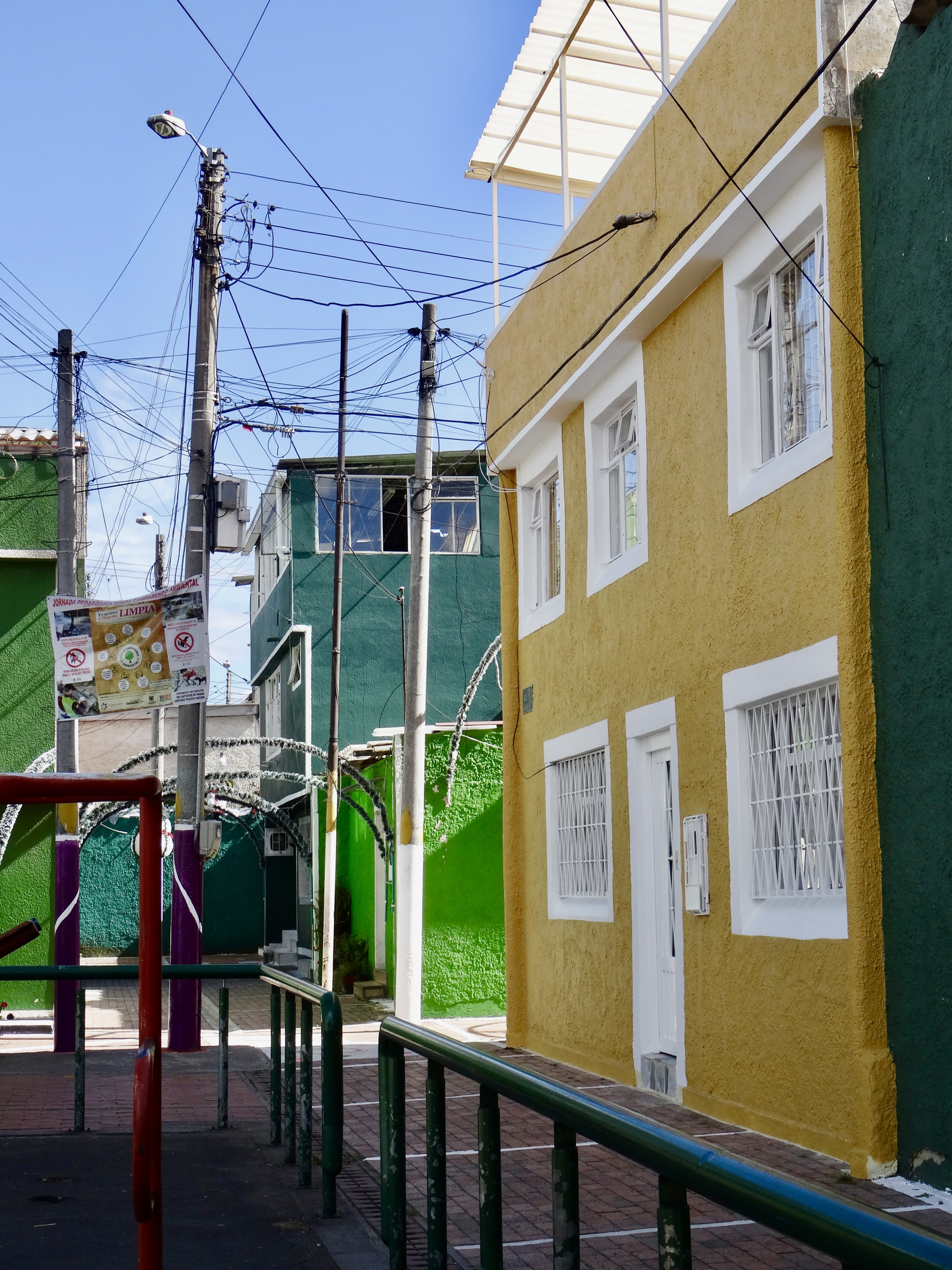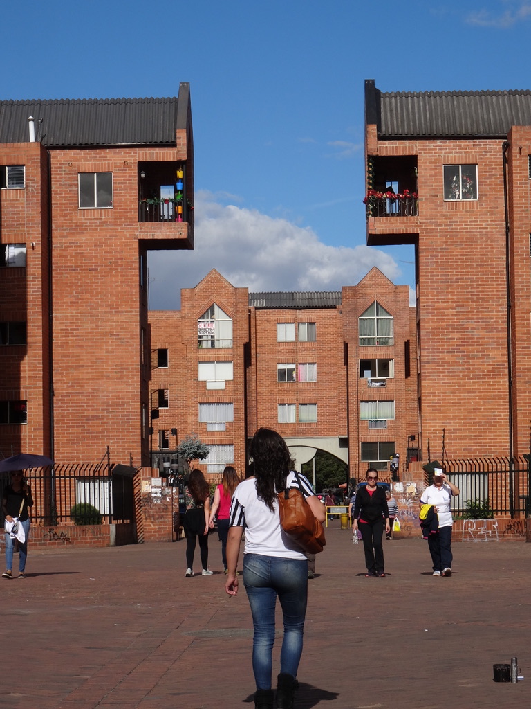 Finally we picked up our real “guide”… Sylvia’s architect friend, Ximena.. and the “tour” began. We visited (walked) about four different projects on the west side of Bogota.. and along the way many others were pointed out. Many were designed by Ximena’s father (who is in his 90s and is still coming into the office) and some by her, although they were mostly self-built or combination of contractor built and self-built… For example in one case, families got a two story shell (no interior walls or finishing) and they also got “approved” plans and five options on how to construct a third floor (which by now — after 20 years or so) are all built up.. In many of the projects the first floors were purposefully designed to be shops so that residents could set up small stores and earn money where they lived above. We also visited projects that were five stories (obviously not self-built) — all walk up, no elevators. Plans for the projects were quite good with parks and child care centers and walkways throughout. In nearly all cases, parking was outside of the project site.