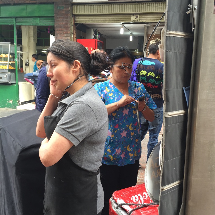 Interspersed within the food stalls are tiny, tiny eateries that can feed about 6 people on stools.. In one, the cooking area was about 6′ x 10′ and four people were working behind the counter, cooking, serving, taking money. We stayed at Paloquemao for about two hours and then headed out.