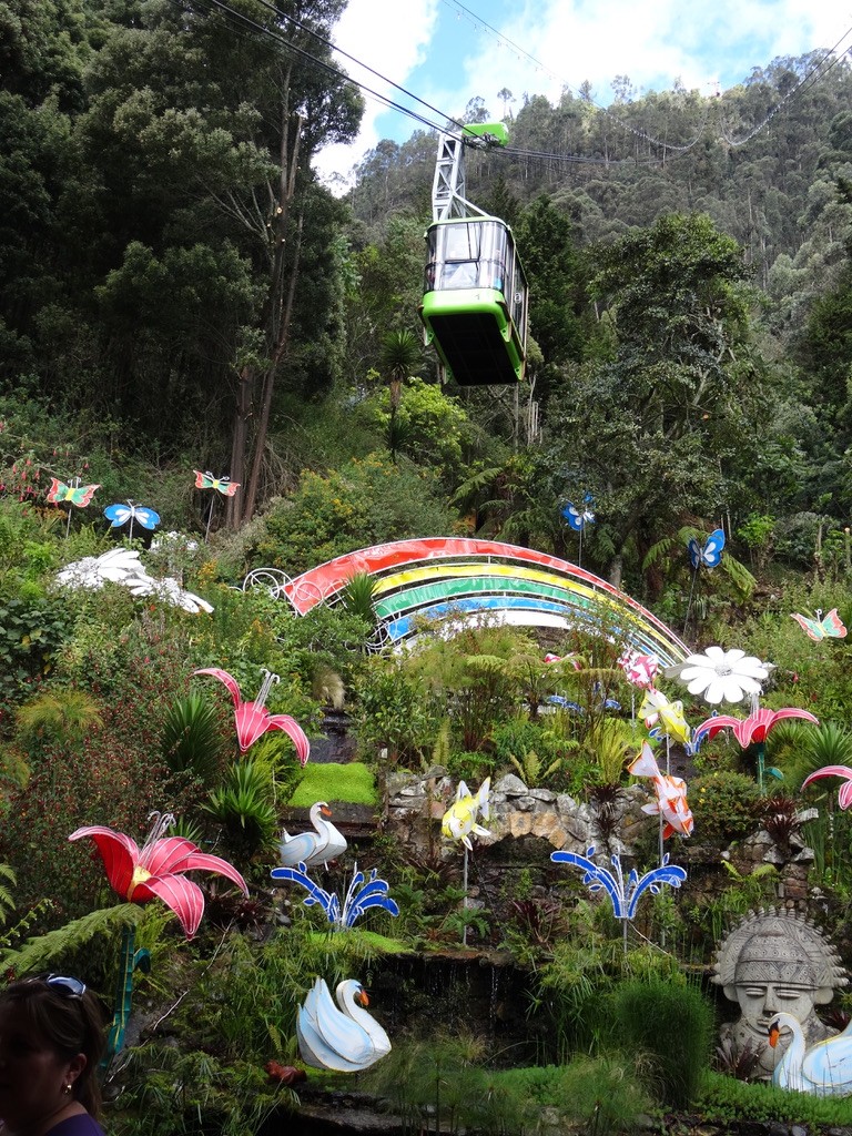 Then we headed to Monserrate (our one concession to being tourists). Monserrate is the highest point in Bogota and you can see it from everywhere.. It’s about 2,000 feet above the highest point of the city.. And Bogota is at about 8,000′ so Monserrate is at about 10,000′. The hill is a pilgrim destination (and obviously also a tourist destination).. There is an old church at the top… It’s accessed (after a taxi ride to the base which in and of itself is probably about 800′ above the city… ) by an aerial tramway (sort of a ski lift but with just two cars that hold about 40 people each.. The two cars are balanced so one is going up and the other going down). It’s also accessed by a funicular (which we had hoped to use going up and the tramway going down). We had used a lot of funiculars when we were in Chile some years ago and they are truly fun… But the funicular wasn’t functioning today, so everyone (and I mean everyone… literally crowds of mostly Colombians and some tourists from elsewhere.) had to take the cable system. You can also climb the equivalent of a 200-story building (which we opted not to do)..