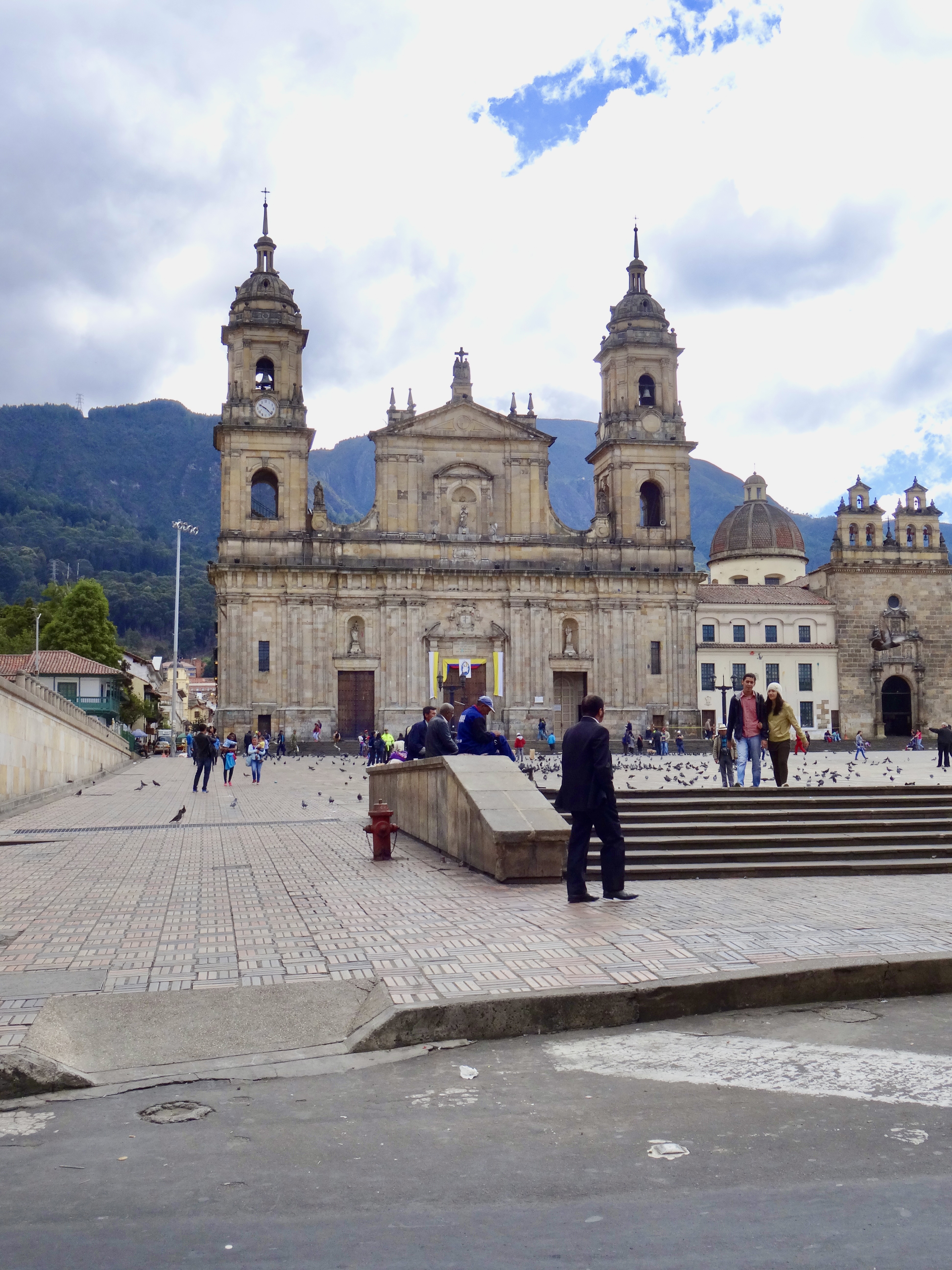 Finally arrived at Candelaria area, which is like the “old city” in other cities… buildings are mostly Spanish Colonial, baroque, and some art deco… Lots of museums are located around this area and there’s the old, large cathedral with a huge plaza out front. People were milling about, vendors were hawking various things to buy.. kids were chasing pigeons. Weather is picture perfect… cooler than Medellin and now as I sit typing this note, it’s actually quite cool… probably about 60 degrees..
