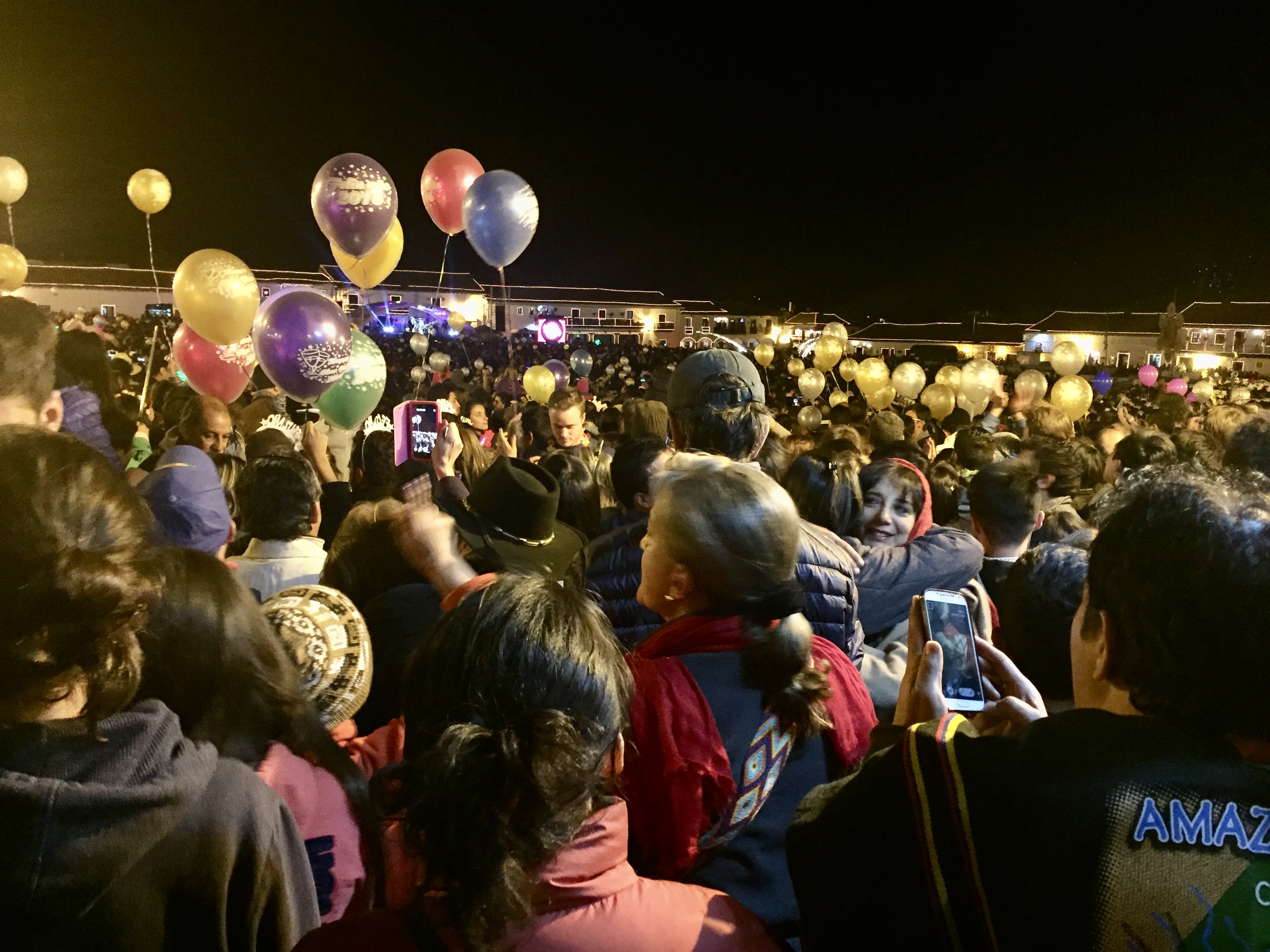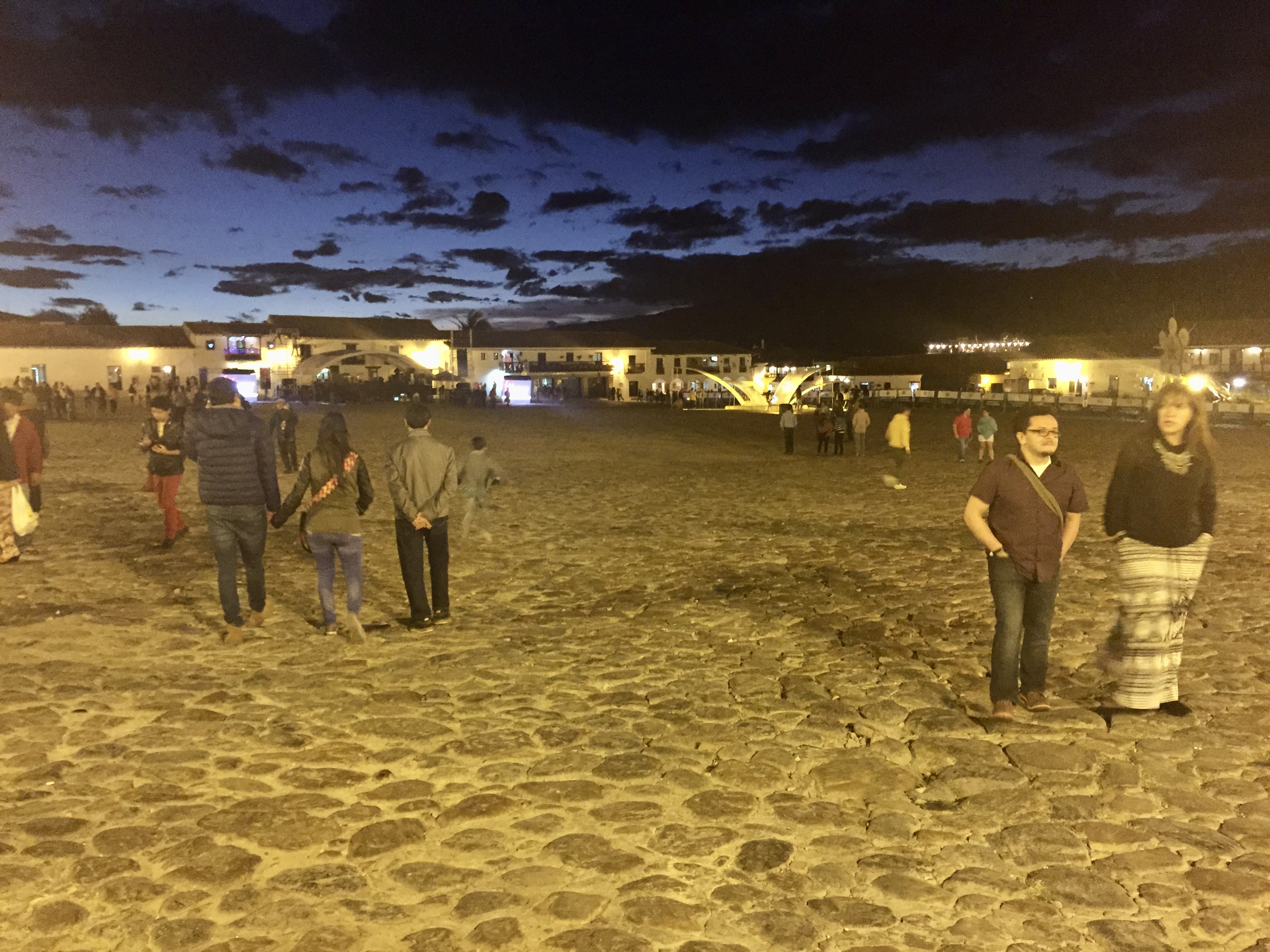 Villa de Leyva is sort of like the San Miguel de Allende of Colombia.. wonderful colonial town built around a very large (and very empty) Plaza Mayor (about 4 acres)… I mean that it is empty of any structures.. even benches.. so it feels even more vast. But it is always filled with people.. and tonight we understand it will be body to body. It is already set up for bands and people are lining the “stairs” that ring the plaza… and it is only 6 pm.. The streets are also filling up. Villa de Leyva is a totally, totally cobblestone street town… But the stones are huge so walking is pretty dicey.. Given my history of spraining my ankle on uneven sidewalks, I’m being extra cautious..