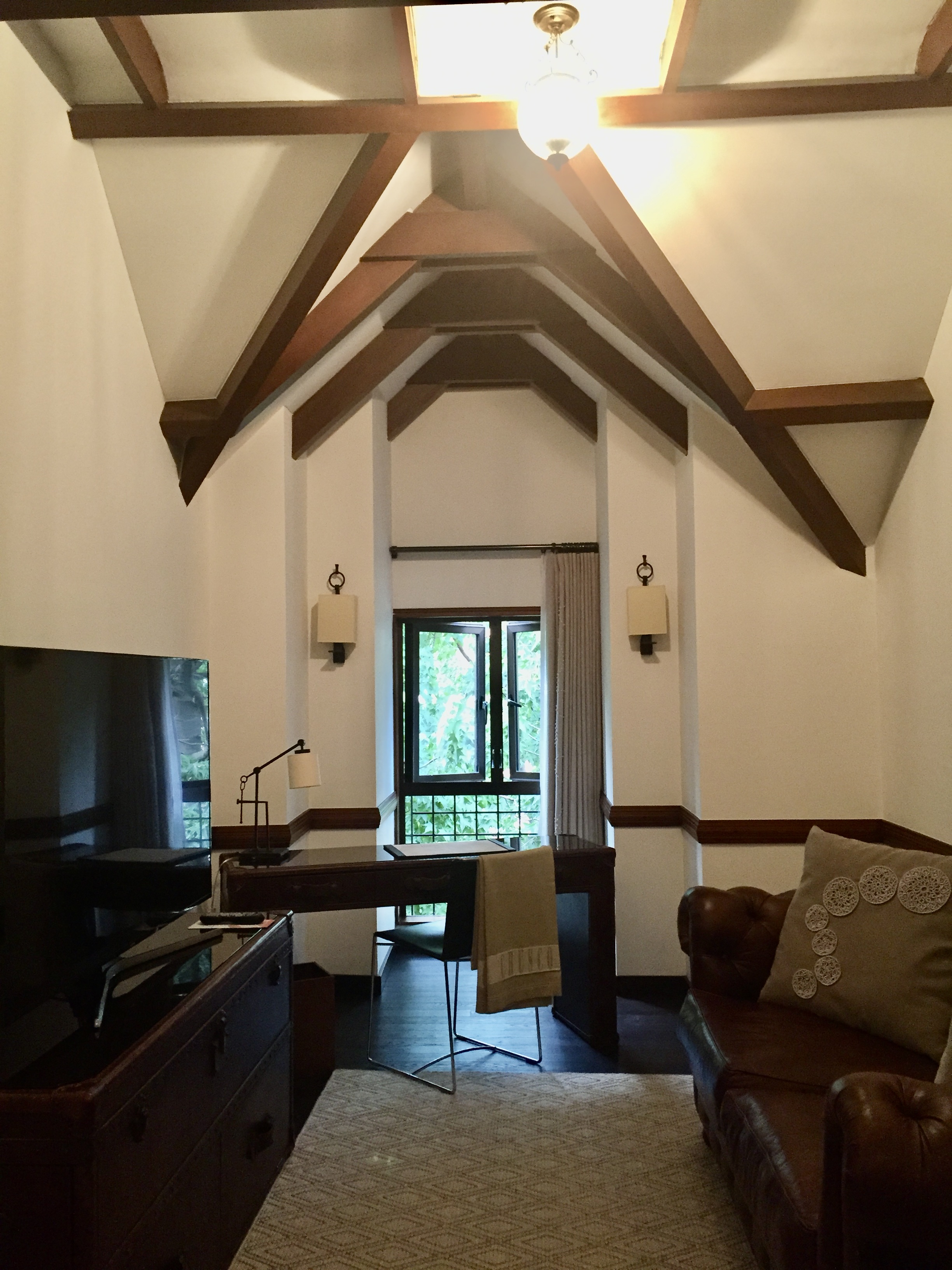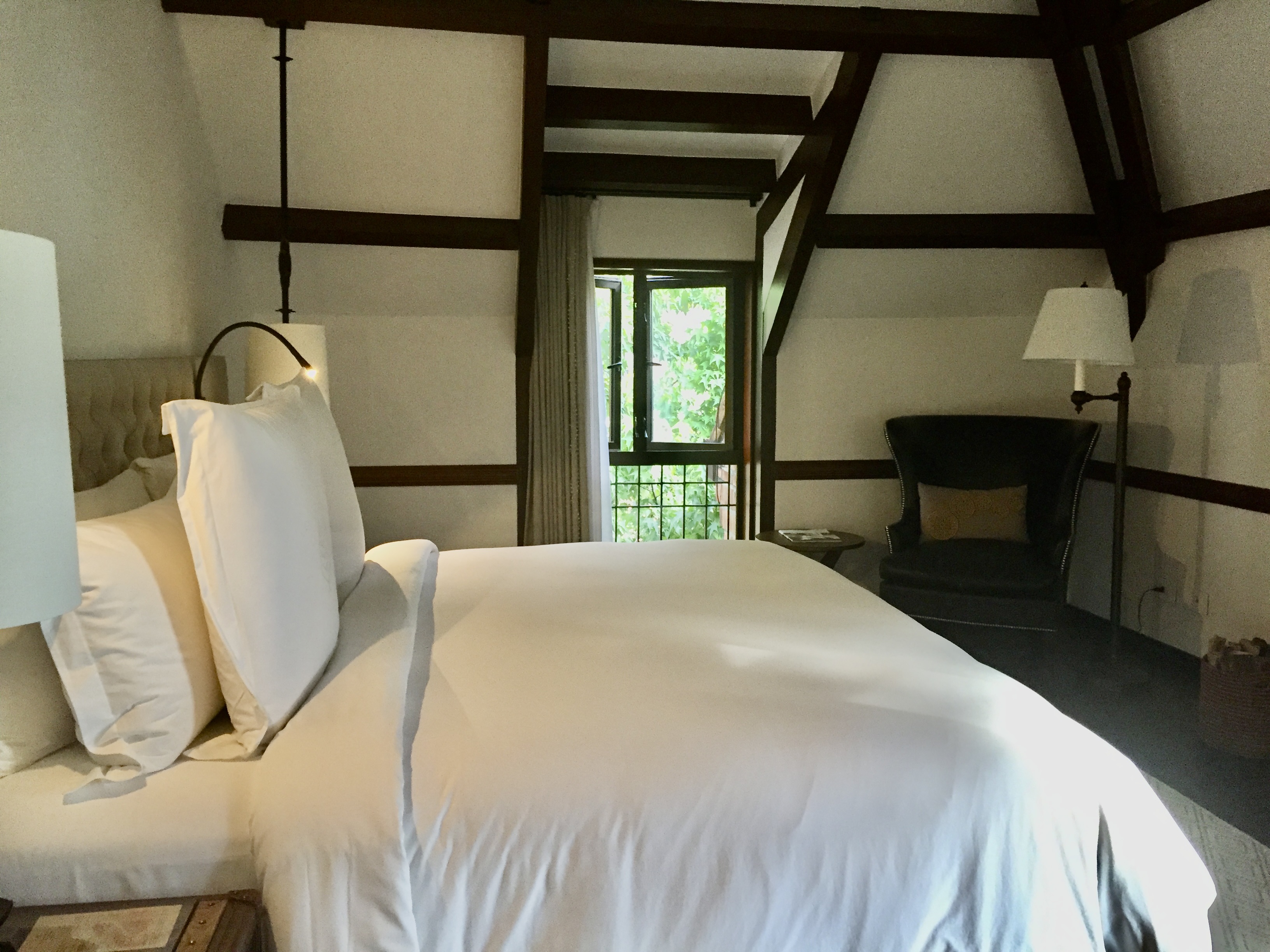 This morning it was difficult to shower until we got the hang of the water situation. Gets pretty hot after about 5 minutes.. stays hot for about 90 seconds.. goes cold for 5 minutes.. gets hot for 90 seconds.. and so it goes. Mike went downstairs to ask about the water and a guy came up to the room, but he only stayed during the 90-second hot cycle. That said, the place is quite charming with courtyards and great light and our room has a little deck (but it looks toward the car parking area unless you strain your neck and then you can see gardens.)