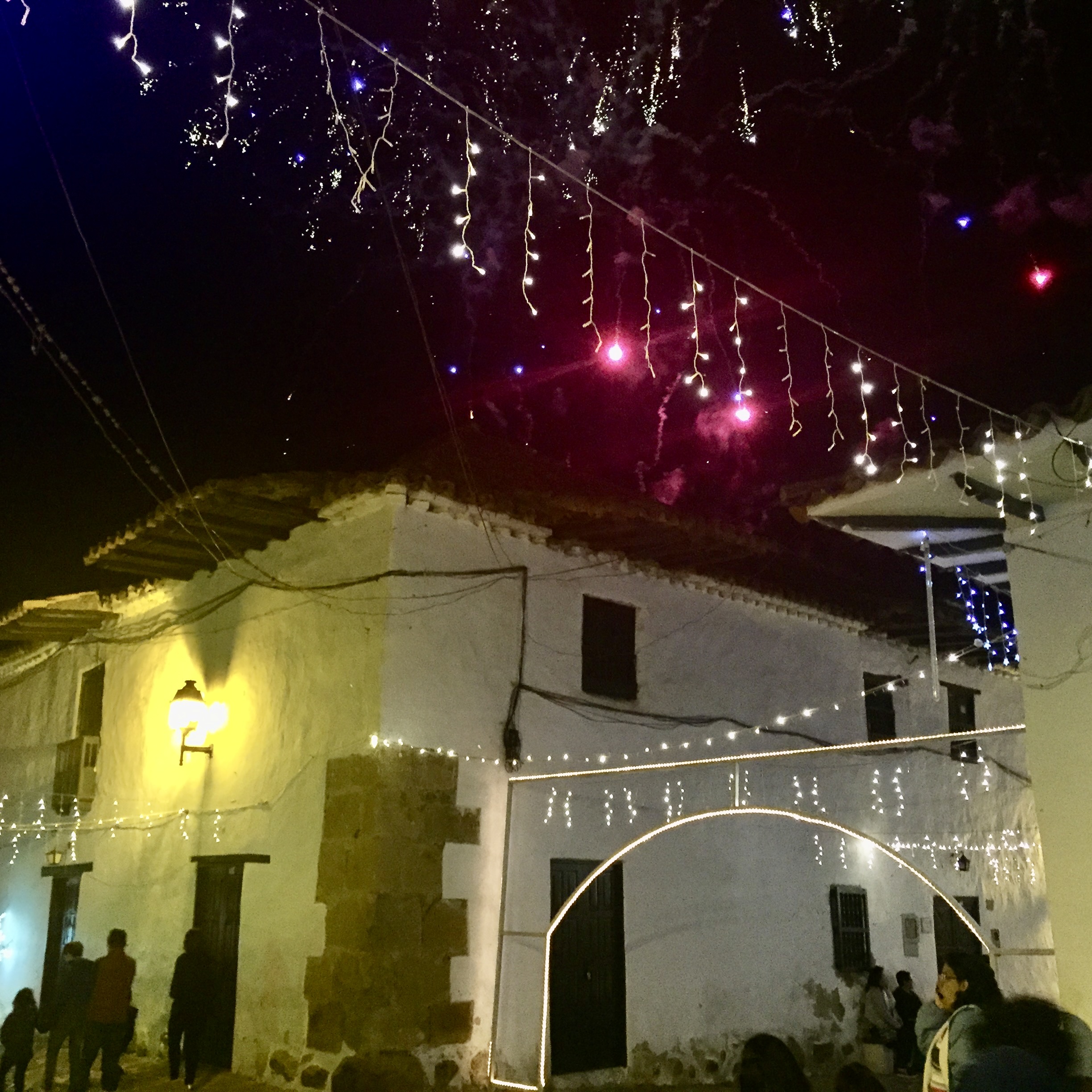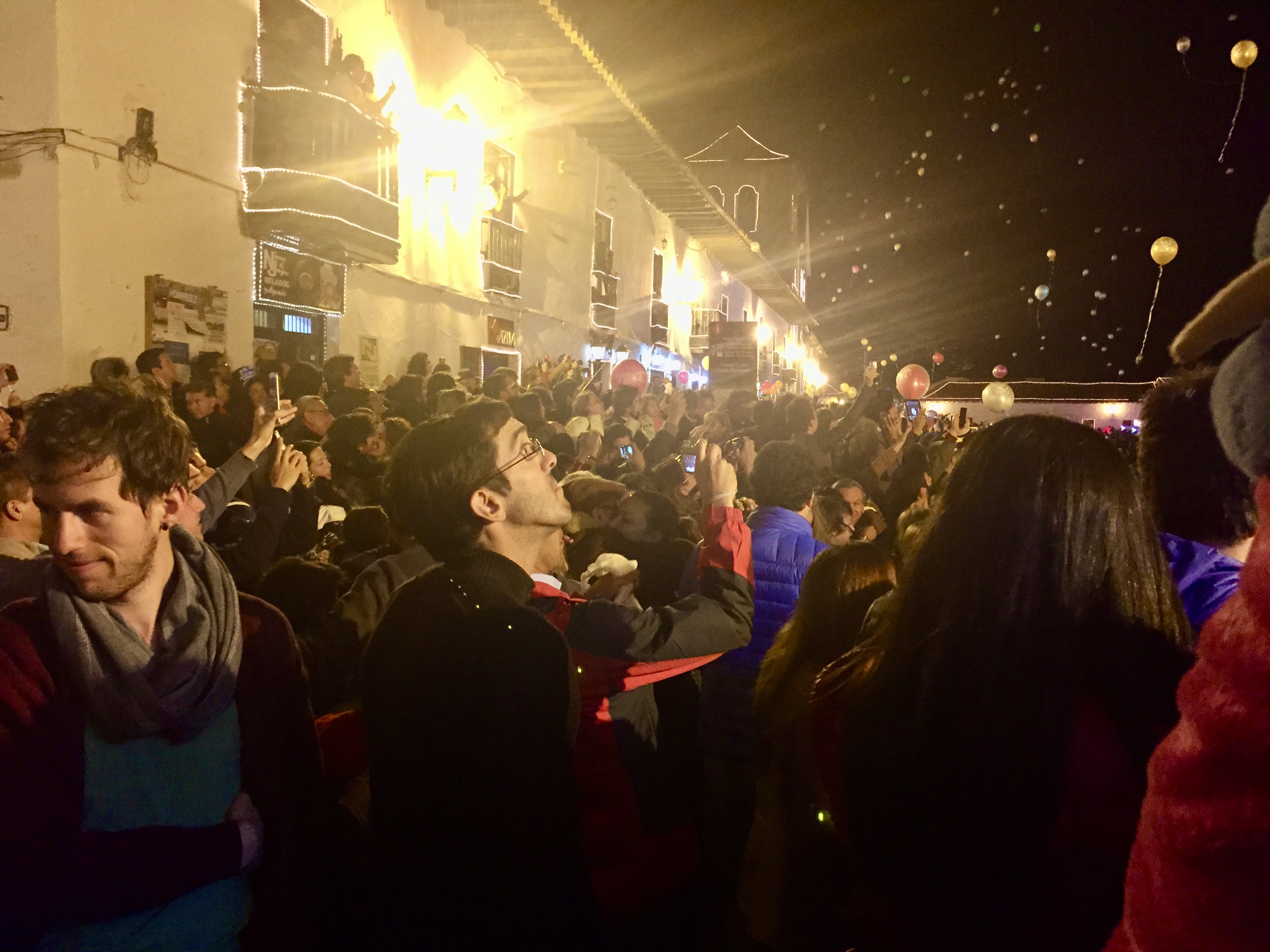 Before we knew it, it was about 11:50 pm and we knew that the Plaza Mayor hosted a big midnight celebration including fireworks.. We quickly moved to get the bill.. and we got to the plaza at exactly 11:58.. It was mobbed — body to body…. big screens around so you could see the bands… and then the countdown.. and exactly at midnight the most amazing fireworks were launched.. lasting about 35 minutes.. non-stop. People were going wild. Everyone was happy, friendly, and taking photos.. Never saw so many iPhones at once.