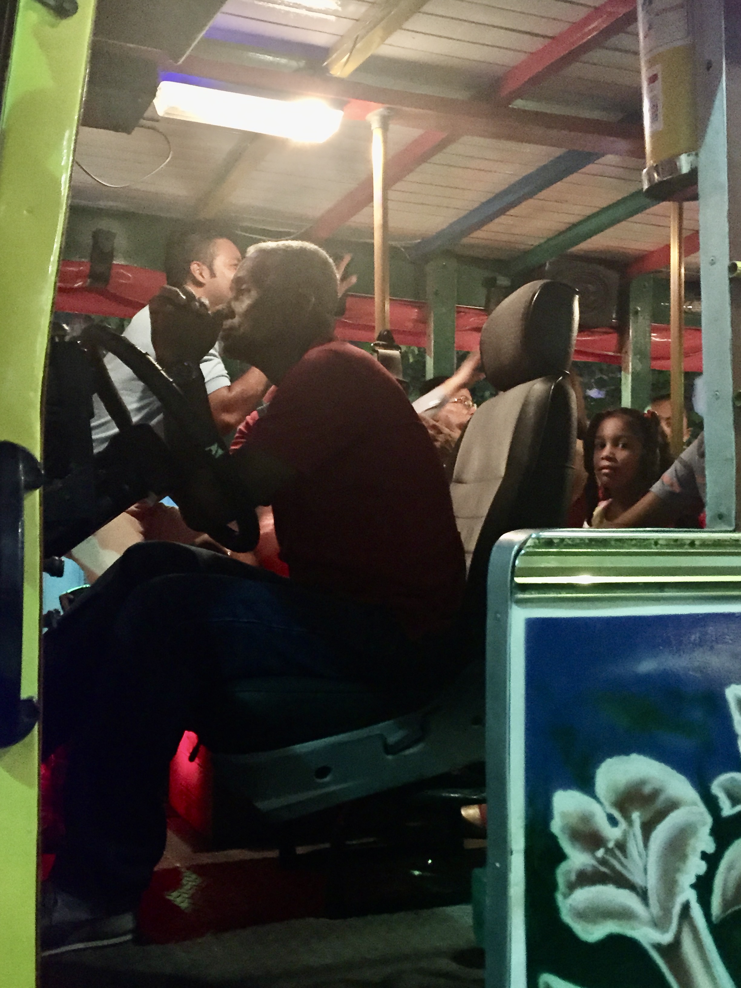 Had dinner at Club de Pesca last night… It was about 1.75 miles from the hotel… We decided to walk, although it was bit complicated — dark streets interspersed with lots of lights for Christmas and plazas that were really decorated. People everywhere, especially once we left the chi chi old section (quite beautiful, but obviously gentrified and forcing those who used to live there into the outer rings — probably closer to the mercado and areas like that). Once we crossed Avenida de Venezuela streets were really packed, music everywhere, food vendors, people strolling, sort of a carnival feeling. Traffic was horrendous so we were glad we decided to walk; would have been sitting in a taxi forever… but we also suffered walking along all the fumes from the idling cars and buses.. Along the way we were walking parallel to two “party buses” — wide vehicles that groups appear to rent… and there’s music on these buses, people were dancing… not sure if they go to a destination or just party on the bus.. Eventually we reached a bridge that we walked across.. it got us over some kind of lagoon.. The restaurant was on the water. When you arrive (before you climb the stairs up to the restaurant which is literally sitting on the water) they “announce you with a bell.