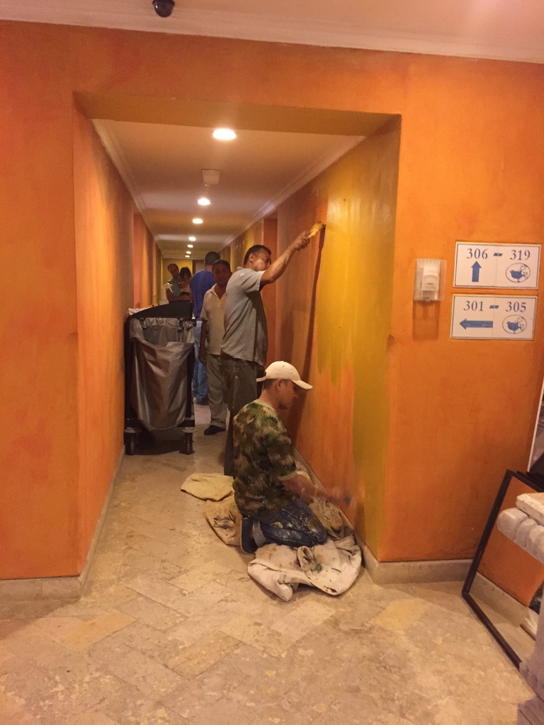 A few interesting observations… Apparently the hotel decided to paint various hallways (didn’t really need it, but guess they wanted it fresh for the holidays?).. so they have about 10 guys painting one wall… gets done pretty fast; each does a strip about 8’wide… so that’s about 80′ covered in literally minutes..
