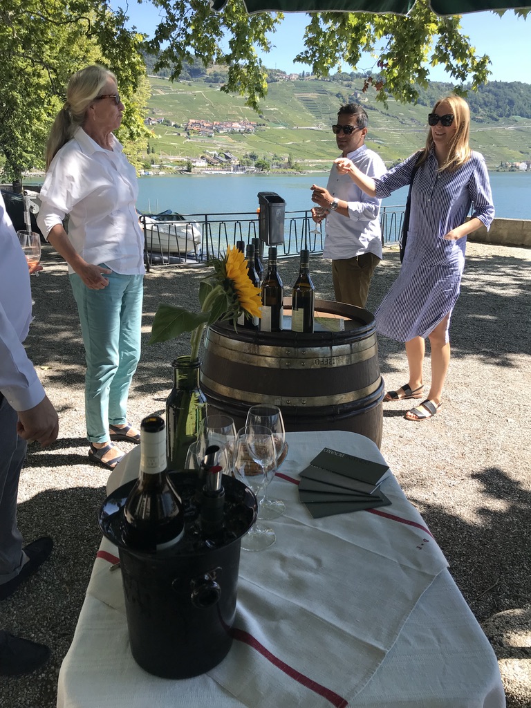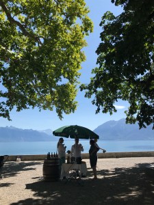 On Monday morning, we all met up at about 11 am and head to the small village of Bourg-en-Lavaux on the opposite end of the lake (Lac Leman) from Geneva.. I believe it is on the northeast edge of the lake. Anyway, the setting is spectacular, with vineyards as far as the eye can see and also the majestic snow capped alps. Julien (Julia’s partner) had arranged for a private wine tasting.. mostly chasselas (a unique white wine of the region). The vineyards were planted and tended for centuries by monks. After the tastings (about 5 different wines I believe, but I began to lose track), we went to the little Auberge du Raisin for a birthday lunch for Julia. Wonderful food, leisurely, and lots more wine and champagne later we headed to a small beach along the lake and then back to Geneva through Lausanne.