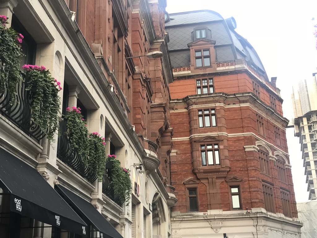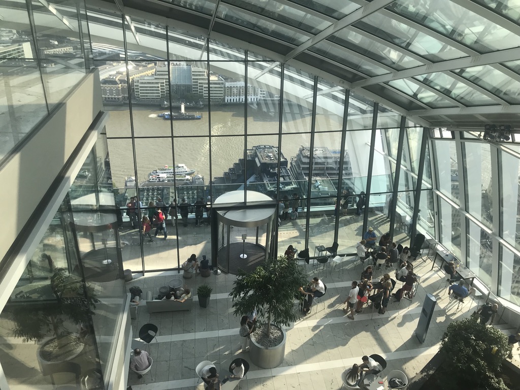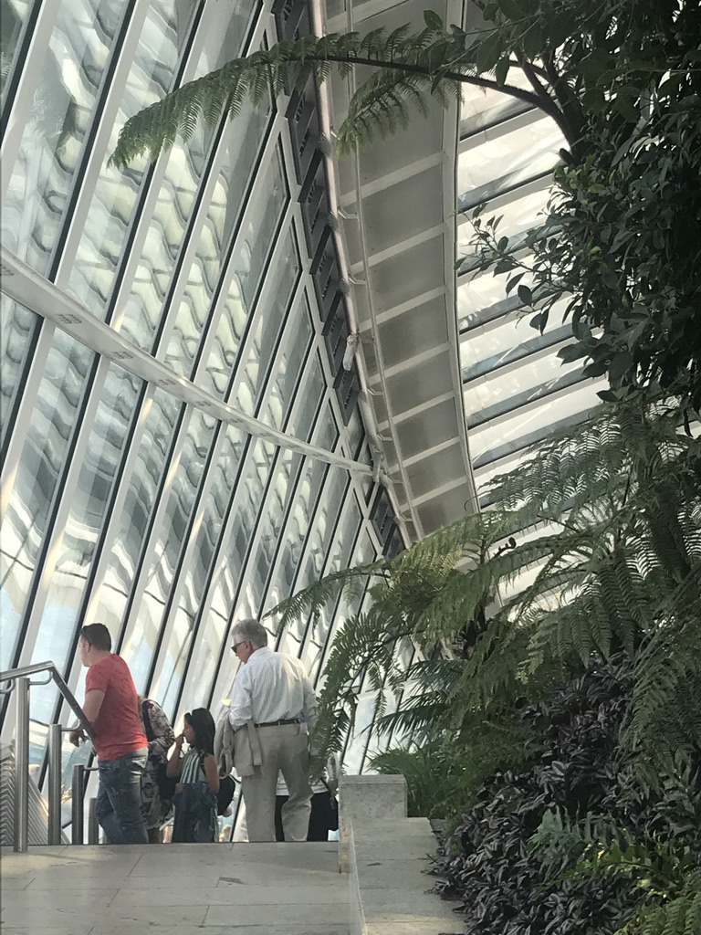 We strolled back to the hotel and after doing a bit of work we walked to the building referred to as the “walkie talkie” – a new building that has a “skygarden”. We had reservations for a late lunch at the top of the building. 20 Fenchurch Road (address and real name of the building) is located in the “city of London” about a 10-minute walk from the hotel (in the financial district). It’s nicknamed ‘The Walkie-Talkie’ because of its shape. The three-floor ‘sky garden’ was opened in early 2015, about a year or so after the actual building was occupied. The shape gets wider as it gets higher. While some people like the building, it was named the worst new building of the year when it was opened.