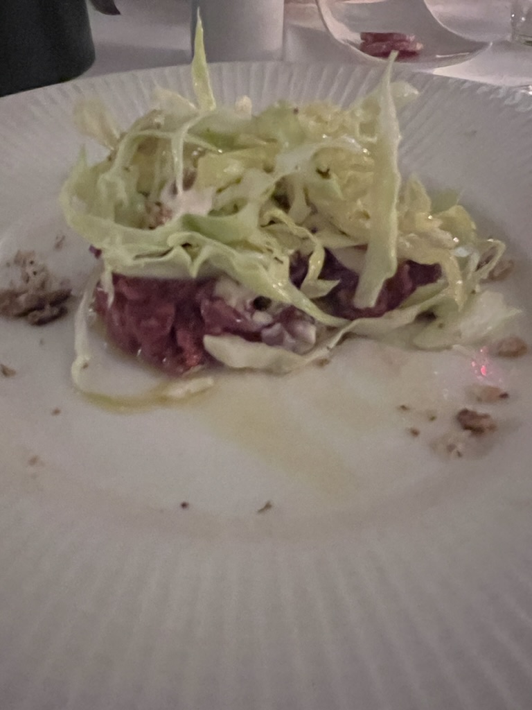 - Warm Egg, Celeriac, Wine, Dried Ham, and I think a Truffle