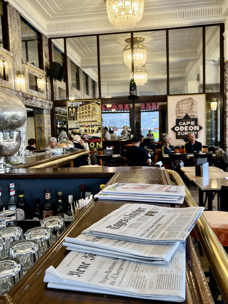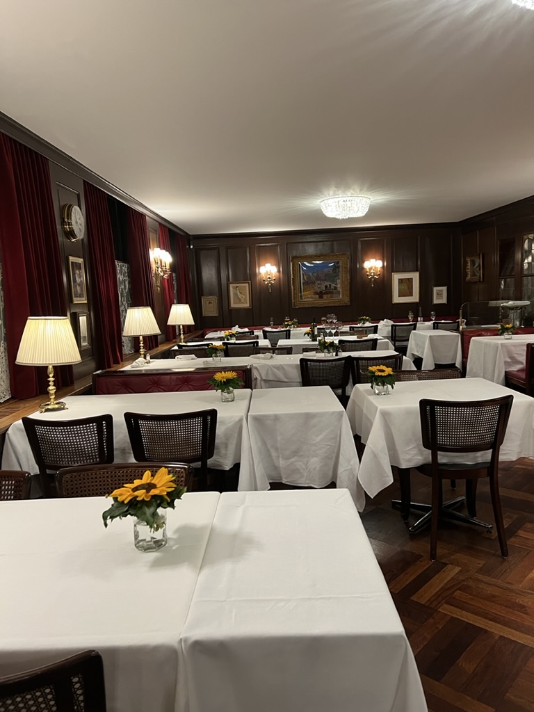 … Well I didn’t quite finish packing, but we headed to Kronenhalle for our last dinner in Switzerland (until we return again in January)… Kronenhalle, like Odeon which is just around the corner is a local institution – established in 1924 as a high-end restaurant. It was home to many artists who wound up paying for their dinners (and drinks) with their art. Thus, the restaurant has an amazing collection of Chagalls, Miros, and many other 20th Century painters. There’s a long history here, but I’m too beat to tell it. In any case, it’s rare to be having dinner with such ”valuable” art staring you in the face as you eat your salad. I’m also presently totally stuffed…
