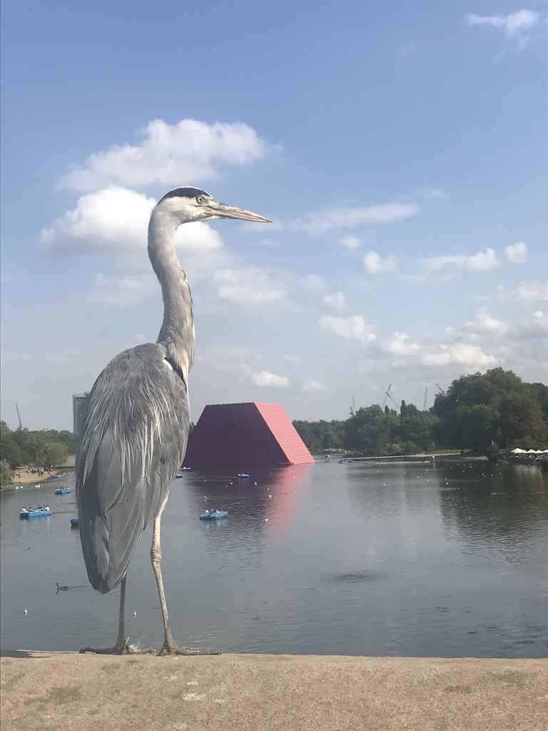 We continued on through Hyde Park to see Christo’s new floating artwork, constructed with 7,506 brightly painted oil barrels. It was a spectacularly beautiful day — not as hot as it has been in London these past few weeks, and not as cool as it might have been.