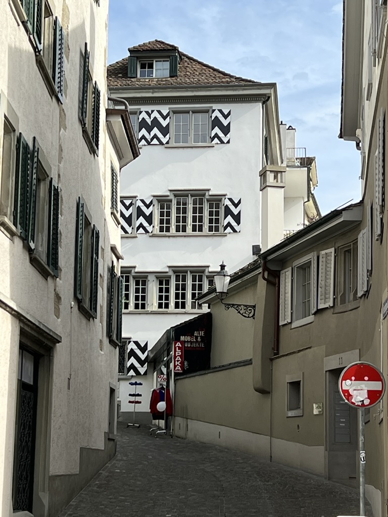 The parking garage in Zurich, where we left our car overnight because we arrived in Zurich pretty late and didn’t want to hassle getting the car to the rental return, has copies of art works throughout the garage: paintings, poetry, quotes by famous people who have some relationship to Switzerland, etc. And the garages are all brightly lit, clean, walls painted in primary and secondary colors, and floors painted in near white with white columns. And still on the car topic, when we returned the car to Hertz yesterday, there were three guys, who we think were Saudis (a father and two 20-ish-something sons; with wives, in hijabs, waiting on chairs inside the rental return building) trying to rent a car. As I waited at the counter, I overheard the conversation. The guys wanted a “fancy and fast car.” The Hertz representative listed all the cars available but none of them appeared to satisfy the guys. Then they turned around and saw our Alfa Romeo being returned, their eyes lit up and they said “We’ll take that one!” The representative said they had to clean it but then they could have that car. Then as one of the guys stated “it’s got good pick up and goes very fast” the Hertz rep said… “you need to be very careful and not speed; there are cameras everywhere; you could be stopped and then the car could be taken away….” I don’t think the guys heard a word. And then I was wondering how they were going to fit 5 adults and one child plus luggage into that car. Well, we were gone before we could see how they did that.