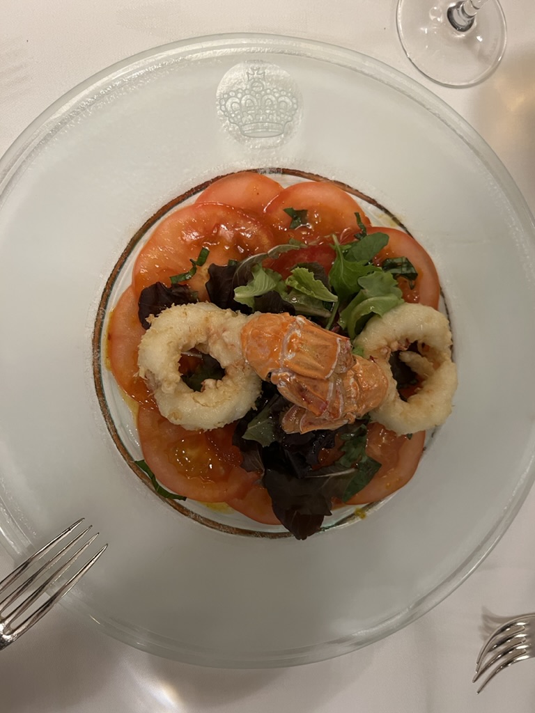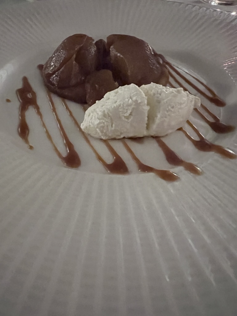 Then a little packing, and off to dinner at La Brisa—a charming little restaurant with amazing food. We started (after two different “gifts” from the chef) with the beef diaphragm tartare which was great; shared the pasta with octopus which was prepared perfectly—octopus was soft and tasty; then we had the crispy pig with some veggies; and finally we had the pear tatin which had a bit of whipped ricotta on the side. I had wine; Mike is abstaining for a few ore days until the Paxlovid is out of his system.